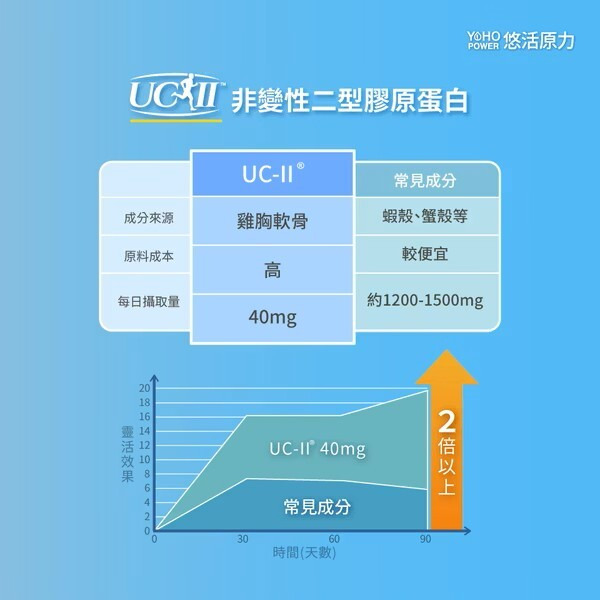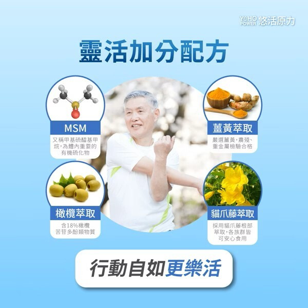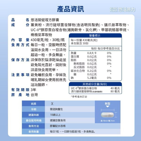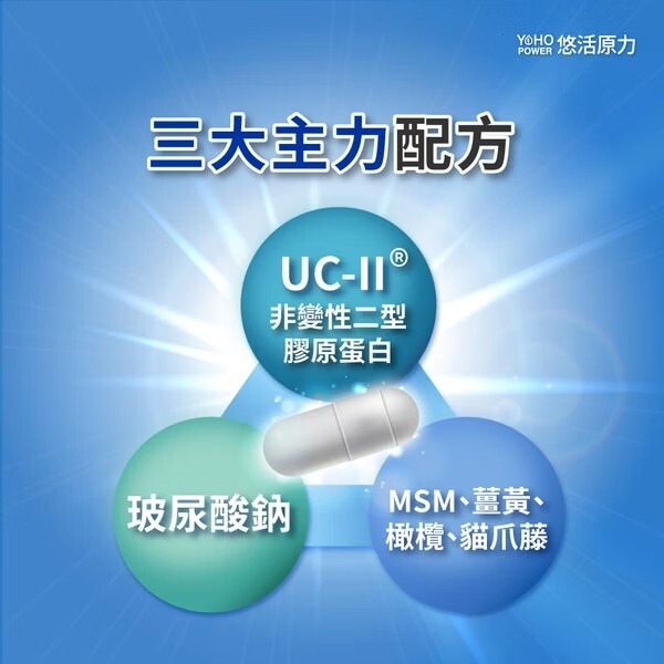 成分 : 薑黃粉、流行鏈球菌發酵物(含透明質酸鈉)、貓爪藤萃取物、UC-II膠原蛋白複合物(雞胸軟骨、氯化鉀)、甲基硫醯基甲烷、橄欖葉萃取物